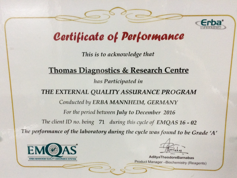 Quality Control is a very key aspect of the work done at Thomas Diagnostic and Research Centre. For clinical biochemistry itself, the Centre is subscribed to the External Quality Assurance Scheme (EQAS) (Department of Clinical Biochemistry, Christian Medical College, Vellore) & also to the External Quality Assurance Program conducted by Erba Mannheim, Germany. In addition to this, quality control checks are performed daily before clinical biochemistry work is started, and quality control checks are performed periodically for clinical haematology.